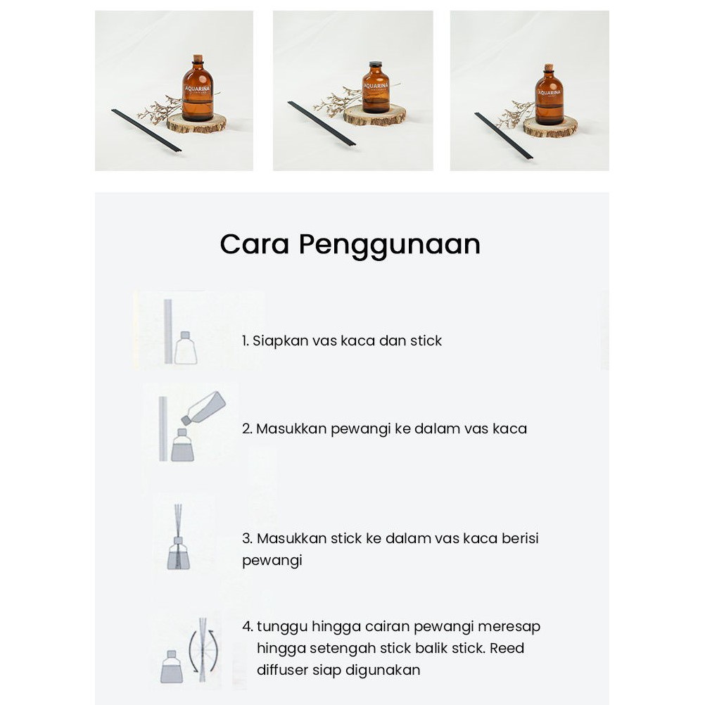 Cara pakai = • pindahkan ke botol diffuser • masukan stick reed yang baru .